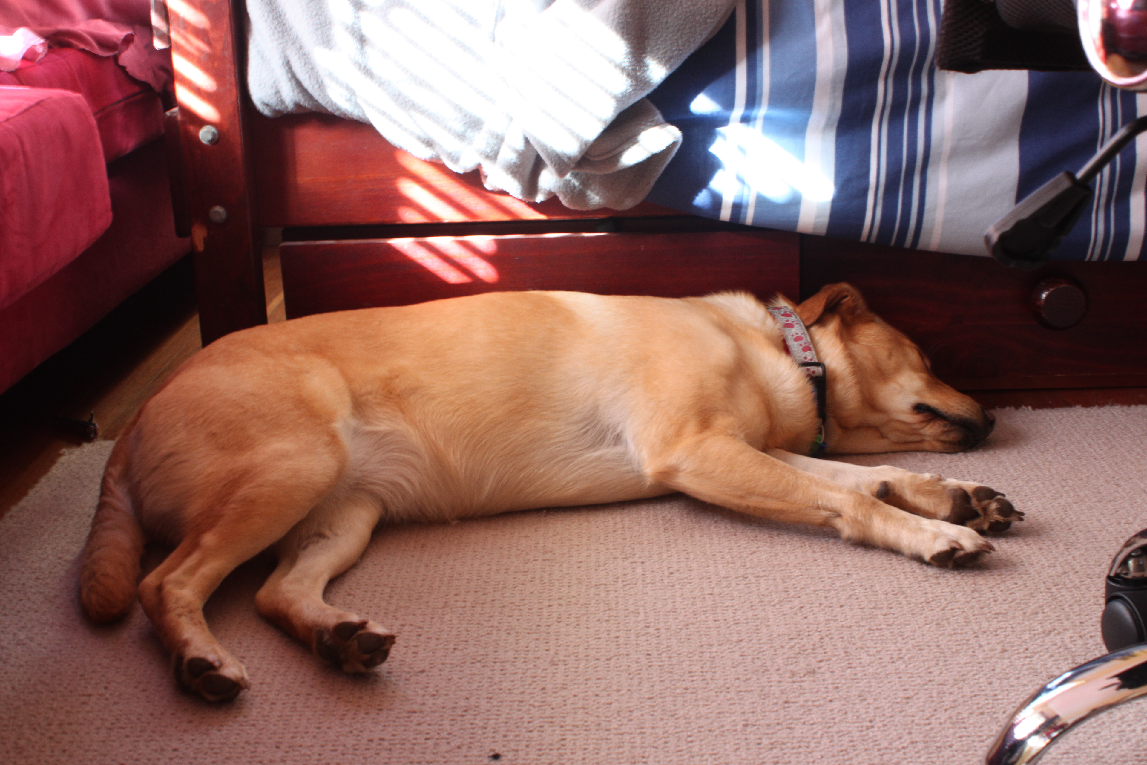 Eveything about this image is about comfort and security. The dog is placed in a corner that seems to be an enclosed space (safety). The soft materials such as couch, bed and carpet and the sleeping dog evoke a relaxed and soft feeling. This composition has a strong context and mood.