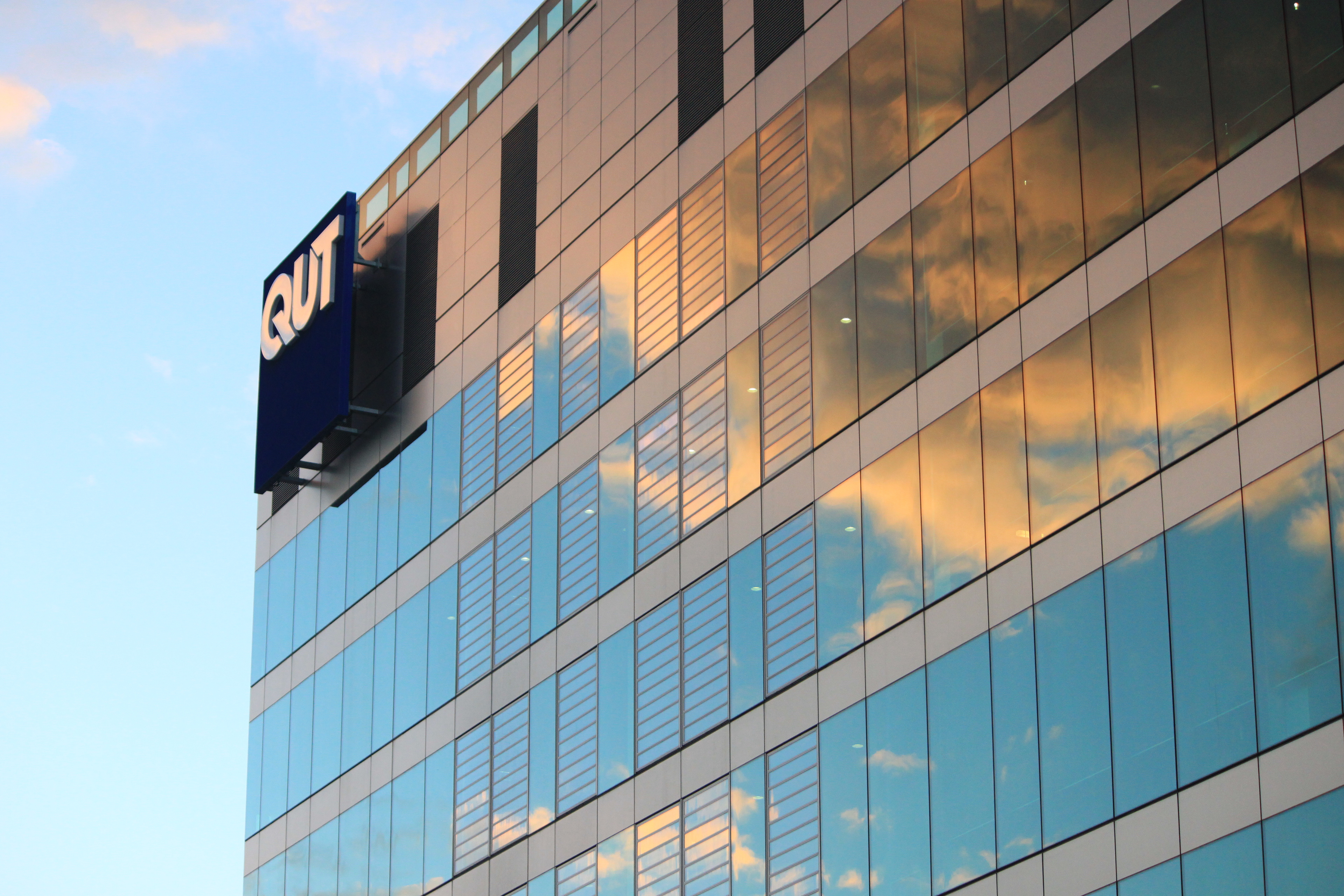 Reflection can give the viewer a different perspective on a building. Often Architects used glazed glass to bring reflections of nature onto the space. Lets be honest, nature looks more beautiful than most human designs. Also doing this can make the building disappear into it's environment giving the feeling like the building hasn't used a lot of materials and is more sustainable. It brings in the concept of nature where there isn't really one and attributes it to the building. In this case I've taken a worms eye view of the QUT P block building. The blue sky and perspective makes the building look like it's very big. Clouds can hold the concept of idea creation. Thus QUT in this image is presented as an idea creator.